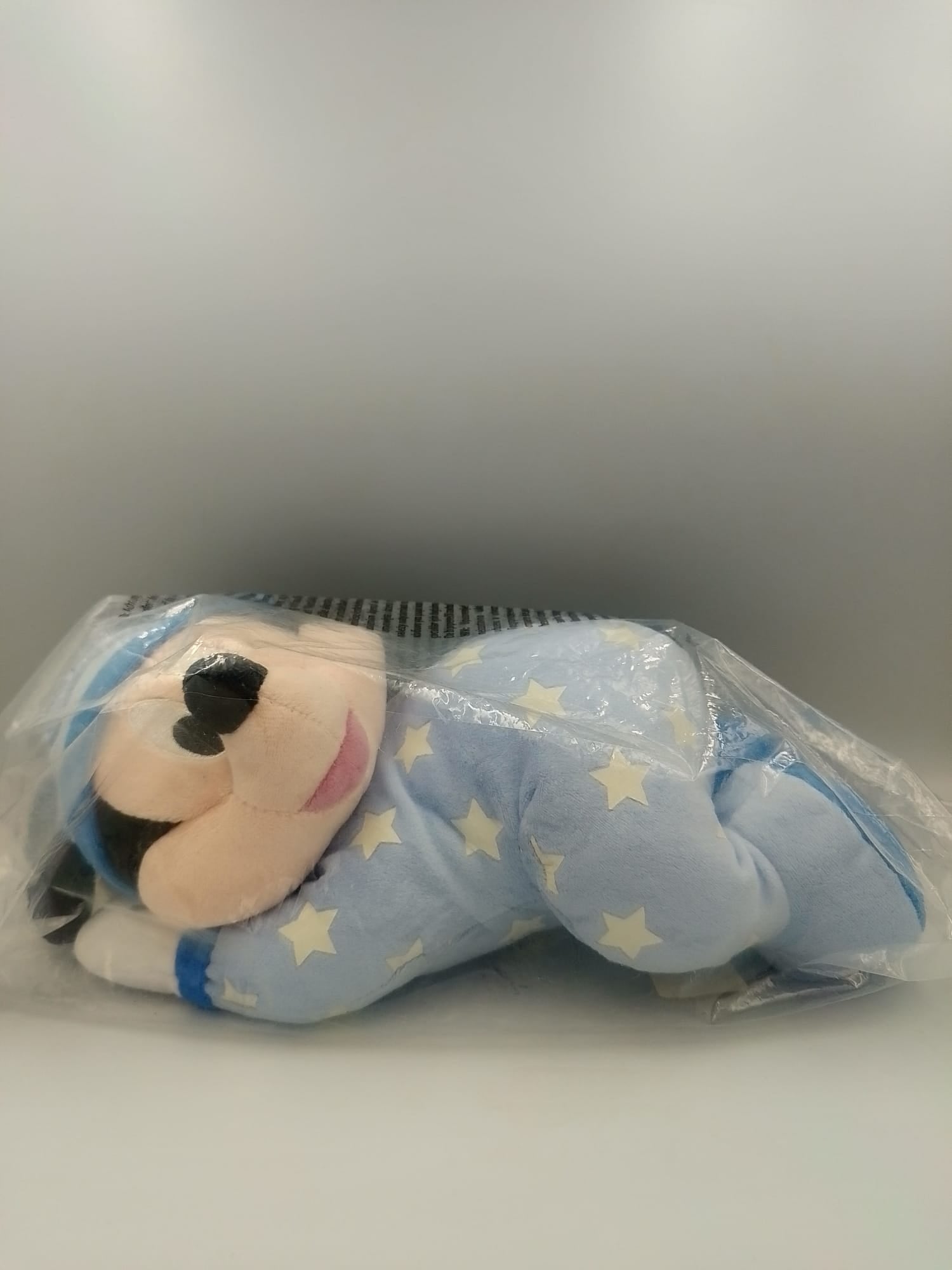Design: Die Plüschfigur zeigt Micky Maus, die in einem blauen Pyjama mit Sternen und einer Schlafmütze schläft.